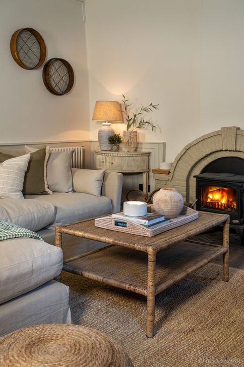 "Although designed for the same clients at 16th Century Mill, the guest cottage called for a lighter, more relaxed approach- a self-contained retreat created to be comfortable, welcoming and effortlessly timeless. With its own kitchen, living and dining spaces, bedroom and bathroom, it offers everything needed for extended stays, while the bedroom’s view across the stream and waterfall provides a quiet sense of escape. Styled in the same calm, country palette as the main mill, the cottage feels connected yet distinct- a place for family to arrive, unwind and feel instantly at home."